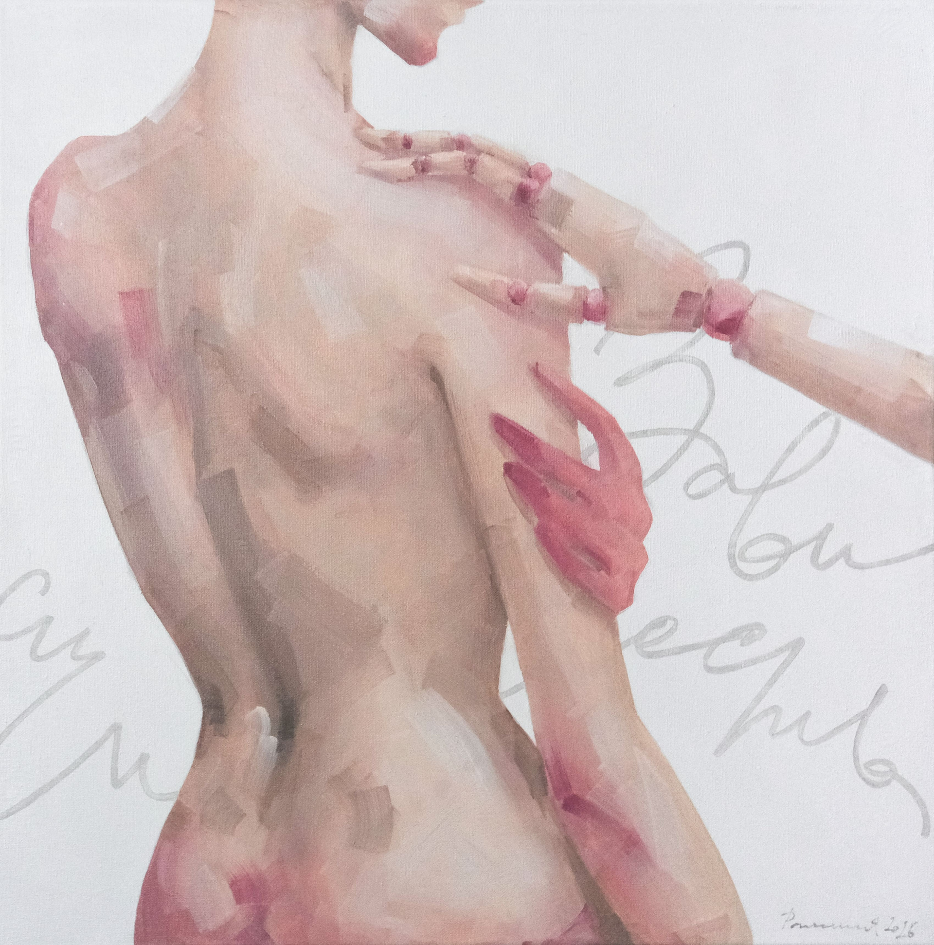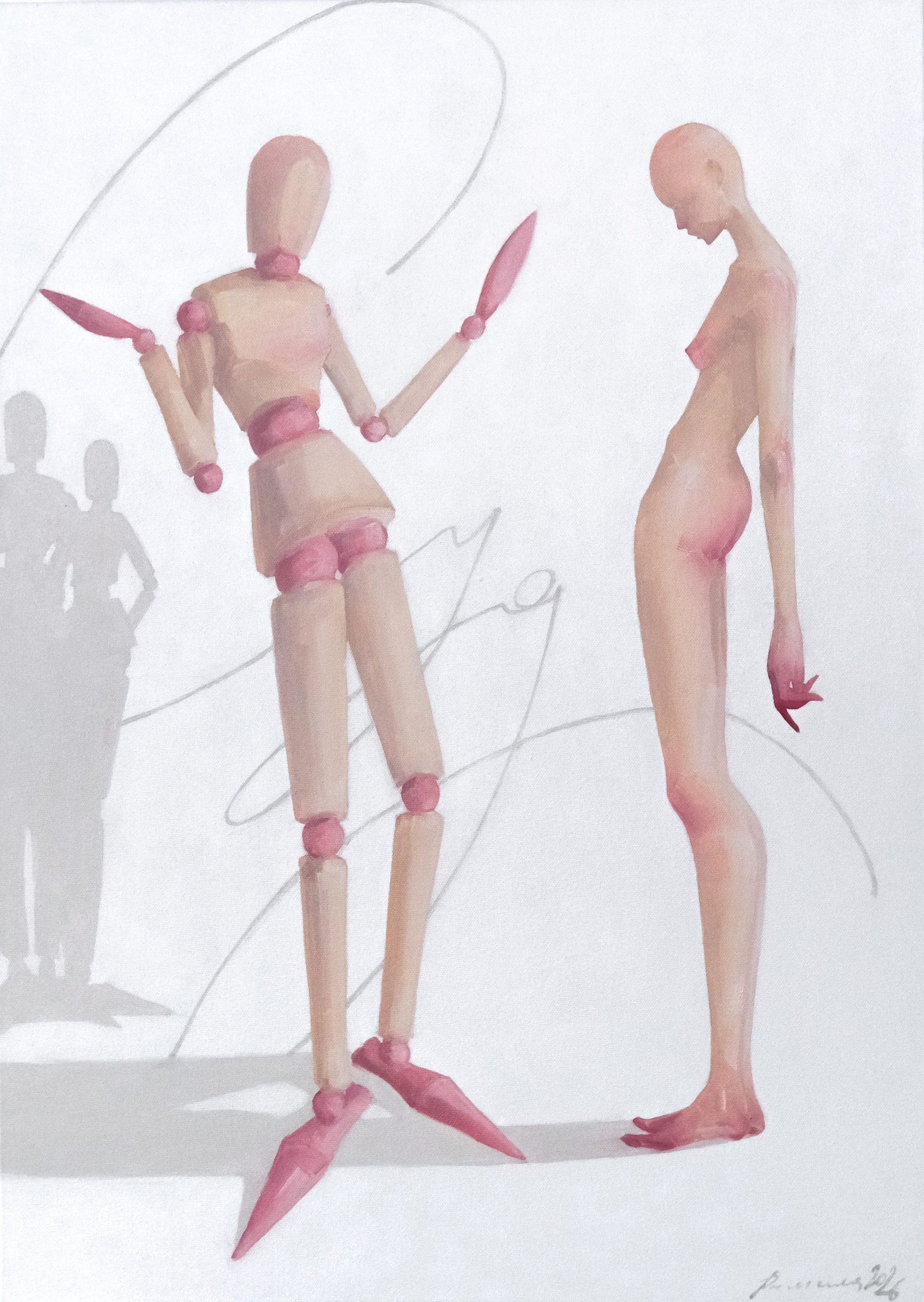 Мой интерес — личность, со своими мыслями и желаниями, а не то, что ее окружает. Поэтому я сознательно избегаю фон и дополнительные объекты в работах, чтоб зритель фокусировал внимание на образе или действии. Два персонажа и их взаимодействие — как метафора дуальности личности — желание быть аутентичным и желание соответствовать. Их действительность и взаимодействие — попытка подтолкнуть зрителя к рефлексии собственных выборов.